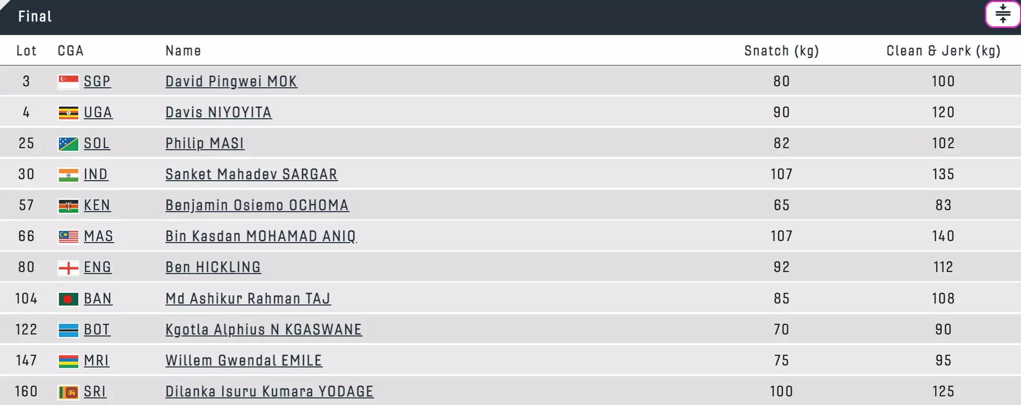 The entry weights show Sanket is overwhelming favourite to finish at the top of the podium.