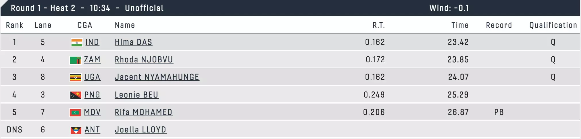 Hima Das's season best is 23.29 seconds. This is the timings from Heat 1. Hima's heat coming up next. There will be a total of 6 heats, with 24 runners qualifying for the semis. Top three from each heat and the next fastest 6 will go through.