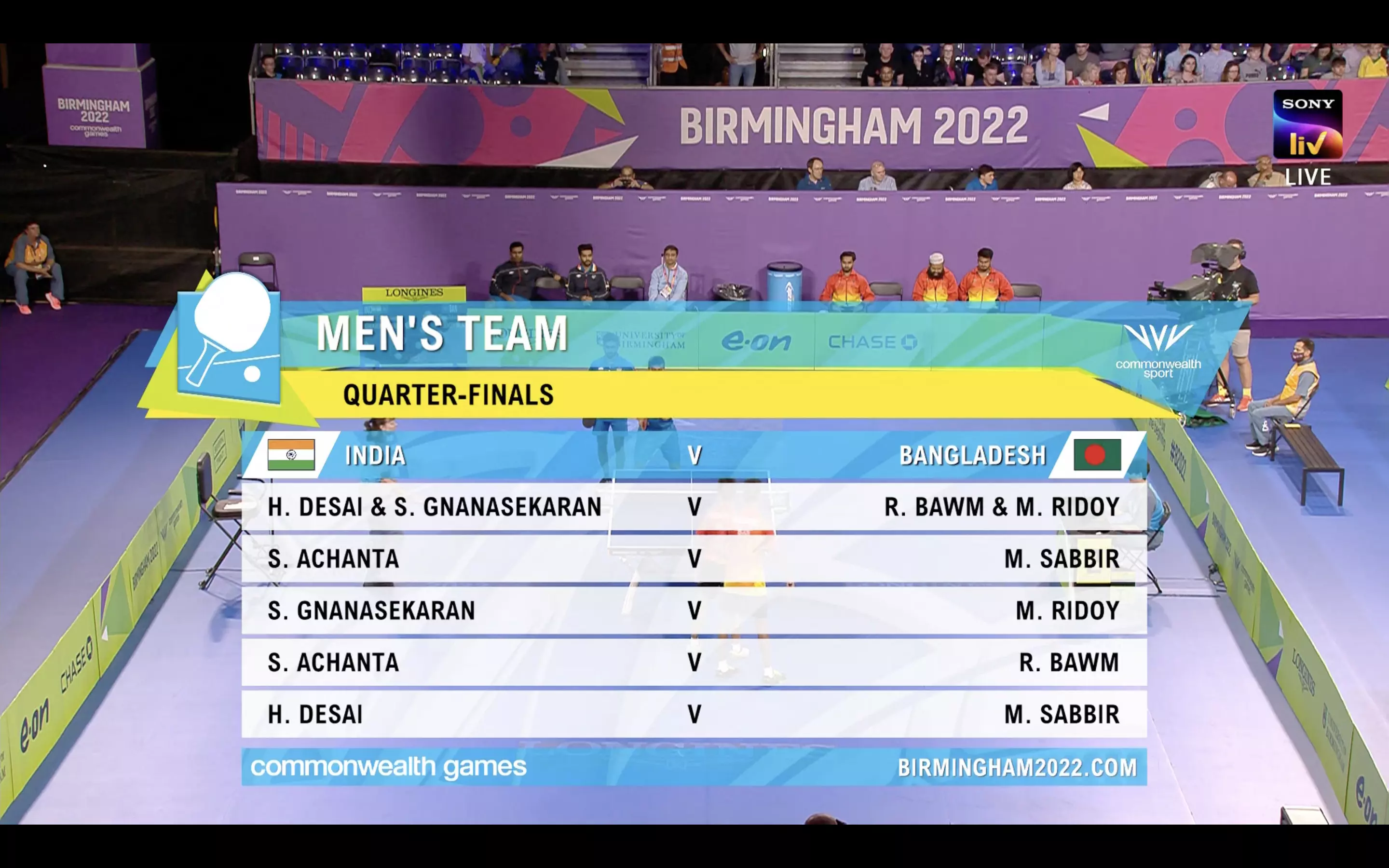 The Indian men's table tennis team led by Sharath Kamal and G. Sathiyan took on neighbours Bangladesh in the quarterfinals of the men's team event and beat them 3-0 to make it to the semi-finals.