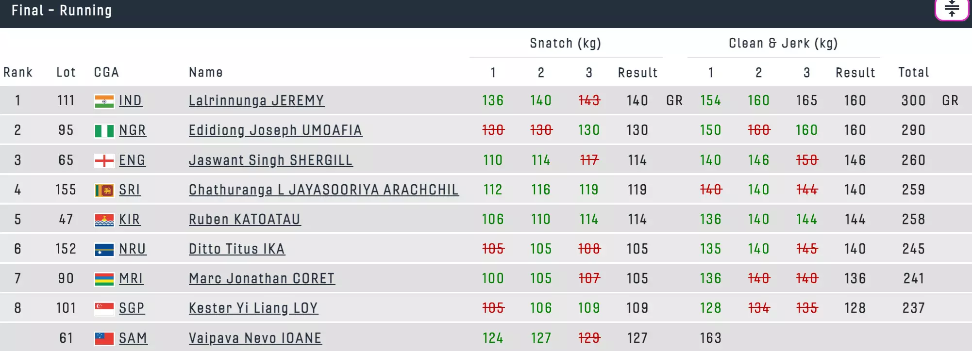 The Samoan fails to get his lift. Jeremy, battling through injury, gets the gold with a total of 300kgs. India's second gold of CWG 2022!