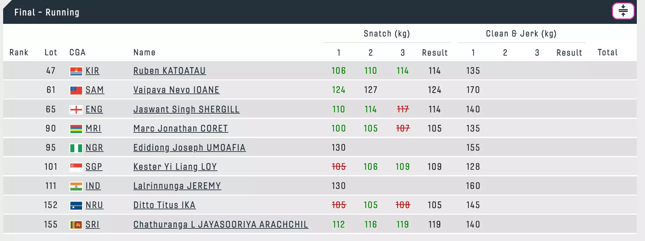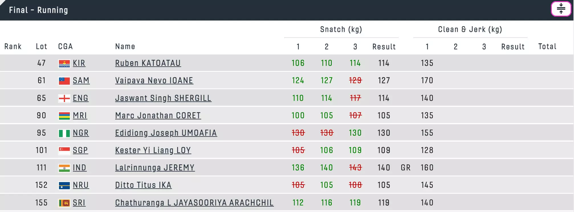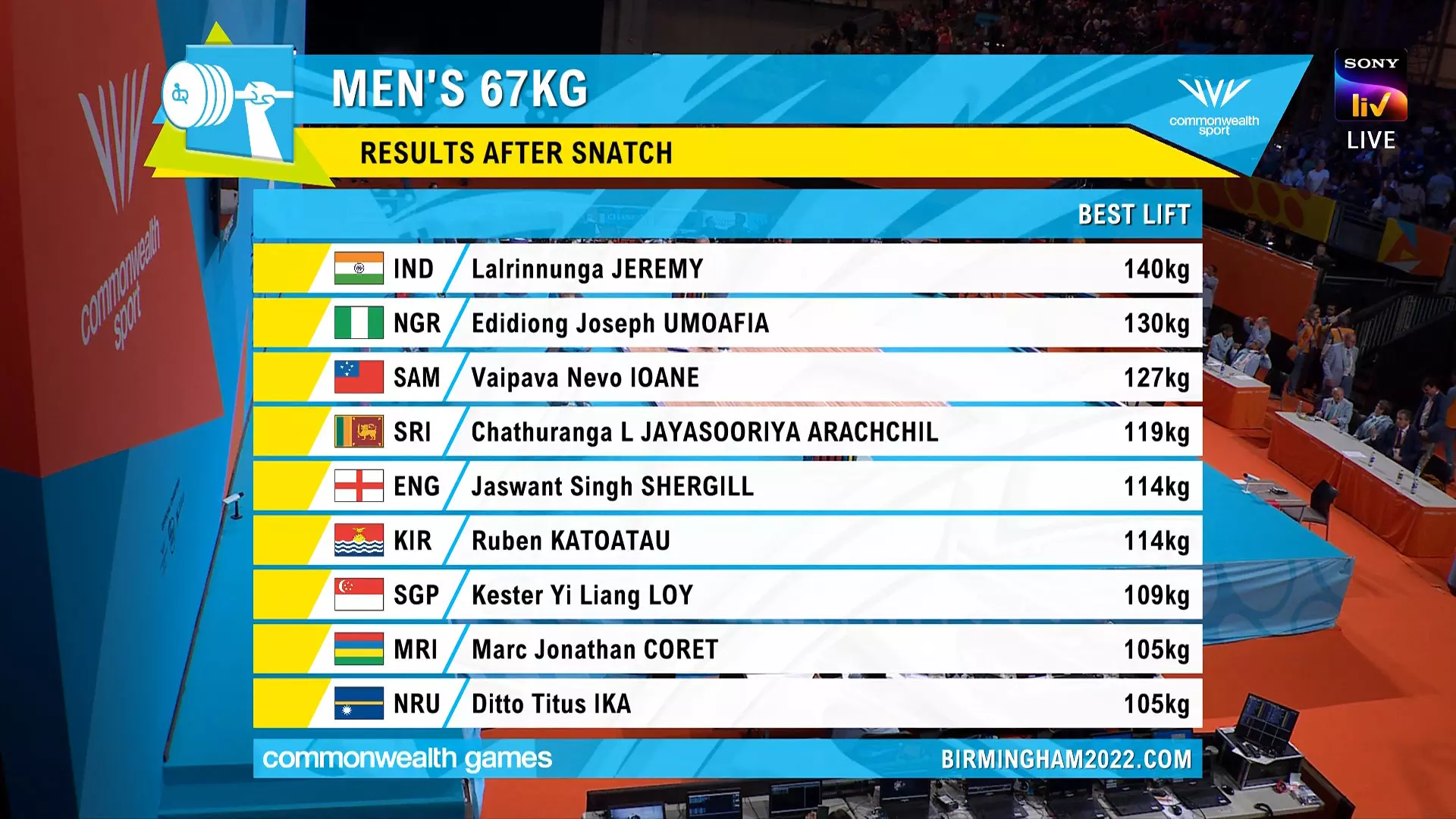 Jeremy! Gets into a massive 14kg lead with his first C&J lift. But concern for India as he goes down on the lifting platform itself with what looks like an injury.