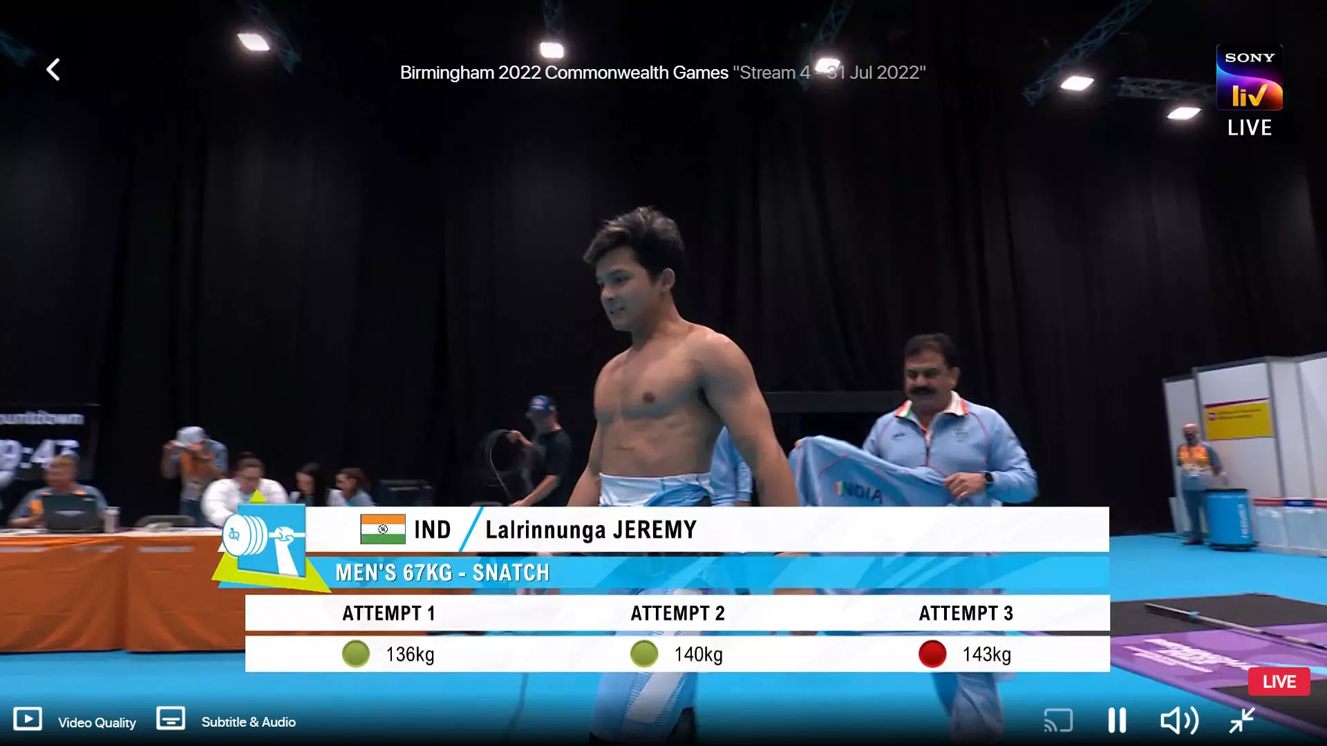 Jeremy lifts 136 in Snatch and goes into gold medal position. He goes for 140kg in his 2nd lift.