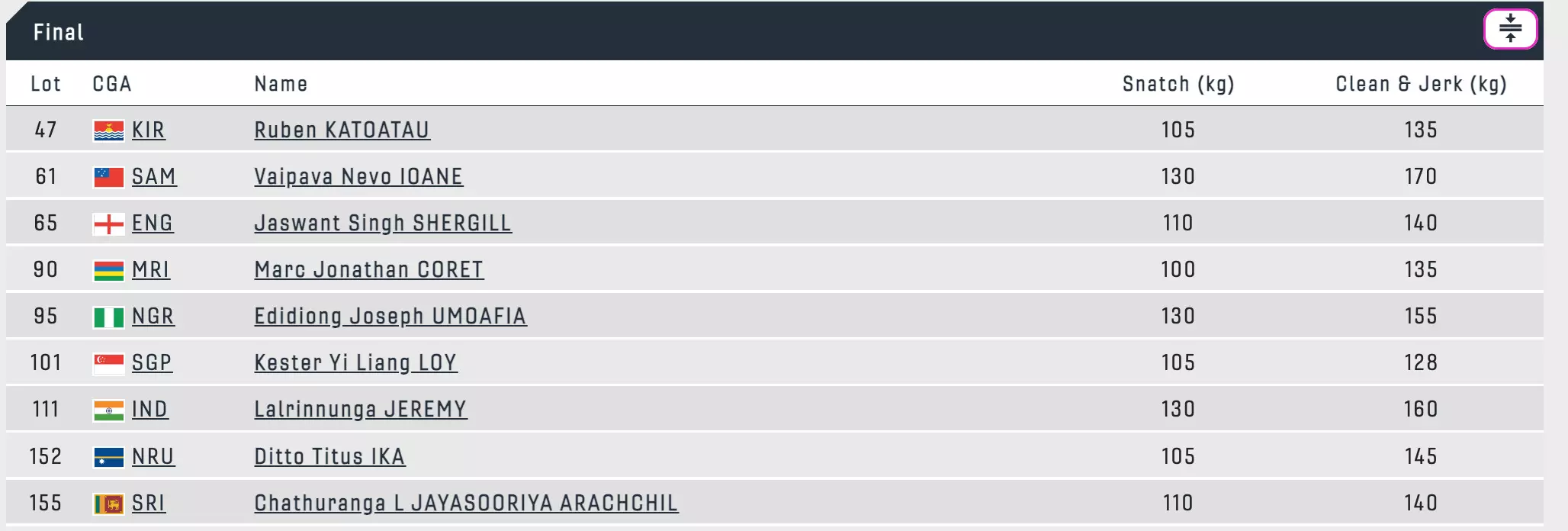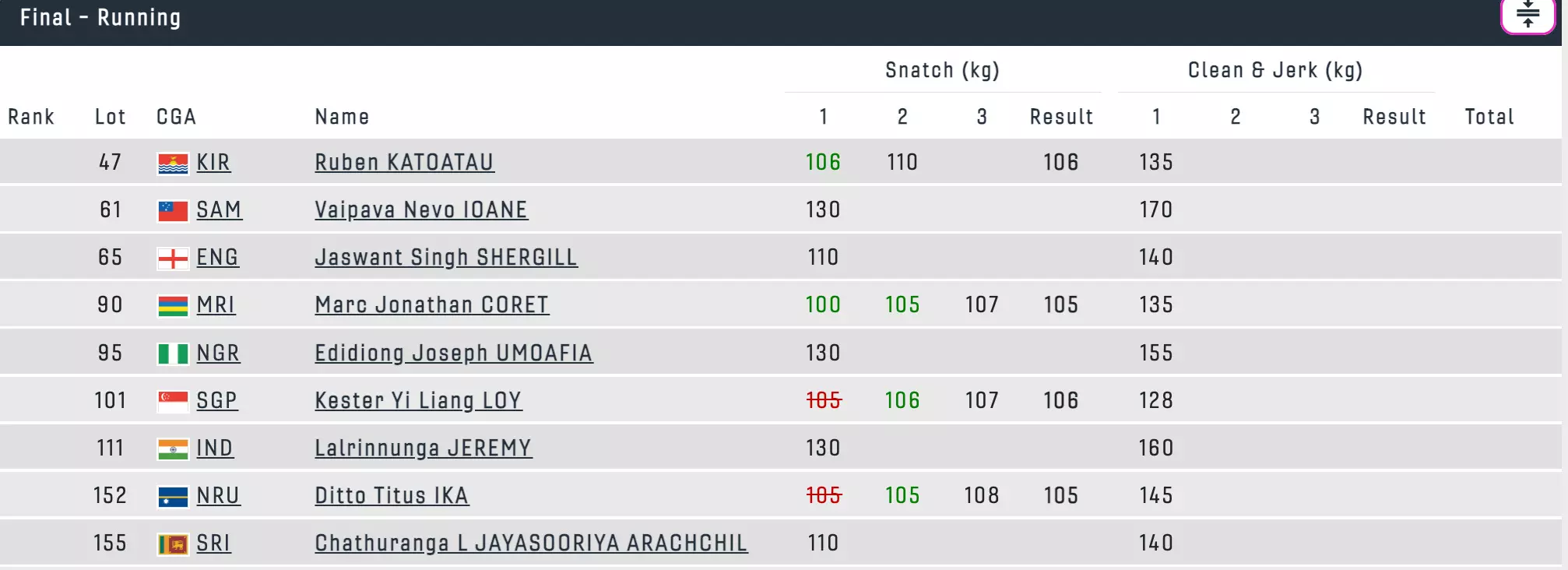 The lifters have stepped into the arena for the 67 kg final. Jeremy is slated to come in at second last.