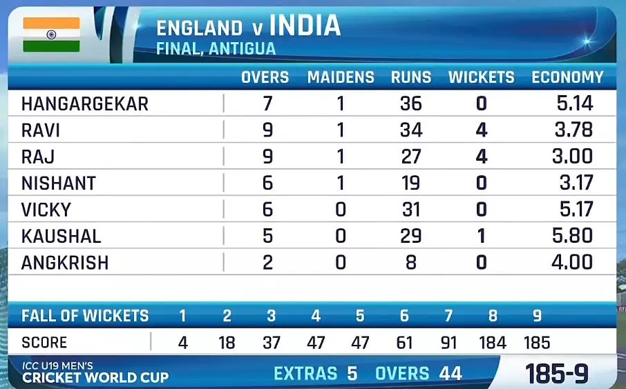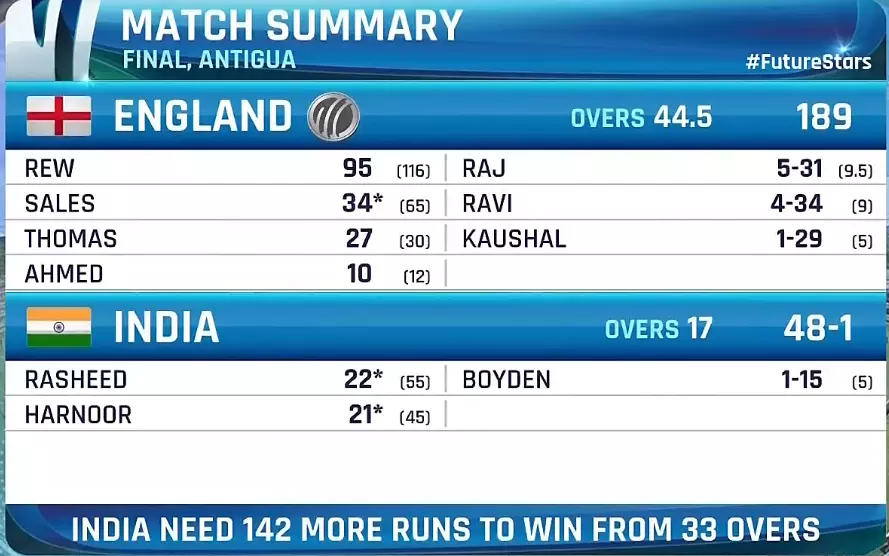 Ravi Kumar (4/34) and Raj Bawa (5/31) dismissed England for 189. Shaik Rasheed (50) and Nishant Sindhu (50*) were the top scorers in India's chase.