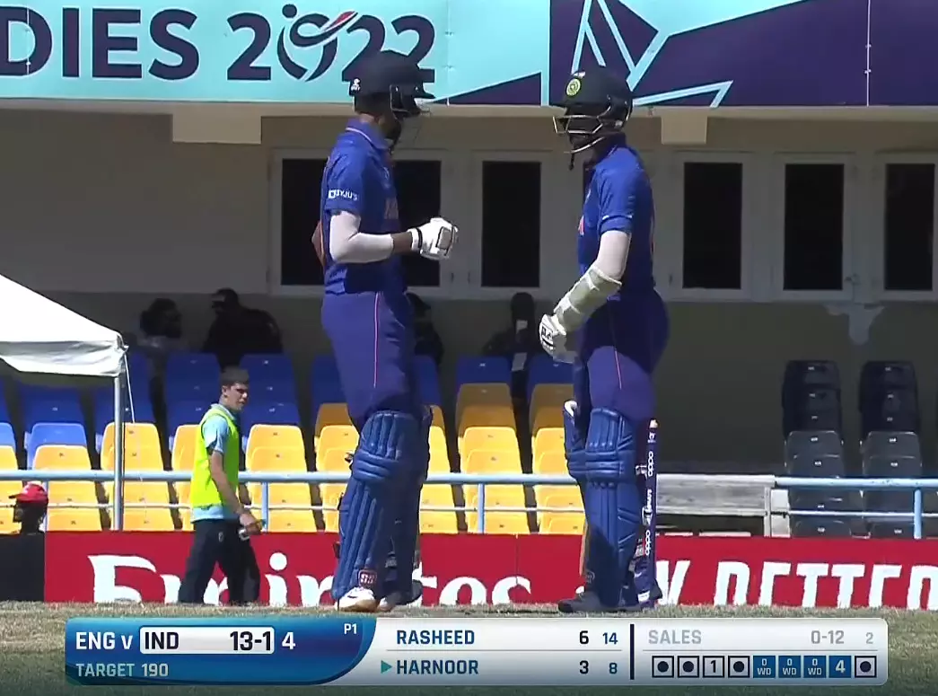 A couple of close shaves for Harnoor, who slices up a few edges. England go to their star all-rounder Tom Prest as first change bowler. Rasheed now in need of some physical attention. He was one of the players down with Covid recently.