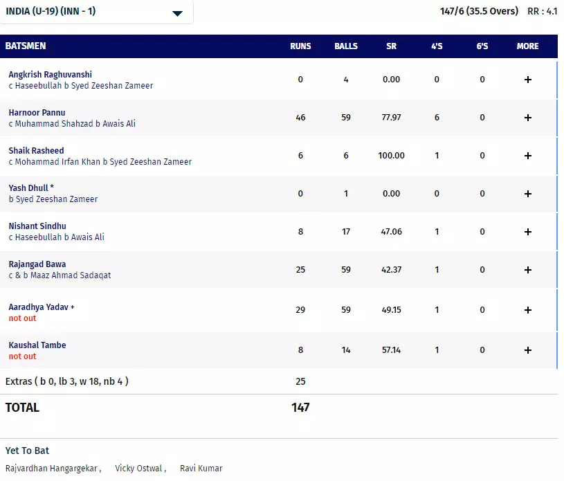India XI: Angkrish Raghuvanshi, Harnoor Singh, Shaik Rasheed, Yash Dhull (c), Nishant Sindhu, Raj Bawa, Aaradhya Yadav (wk), Kaushal Tambe, Rajvardhan Hangargekar, Vicky Ostwal, Ravi Kumar