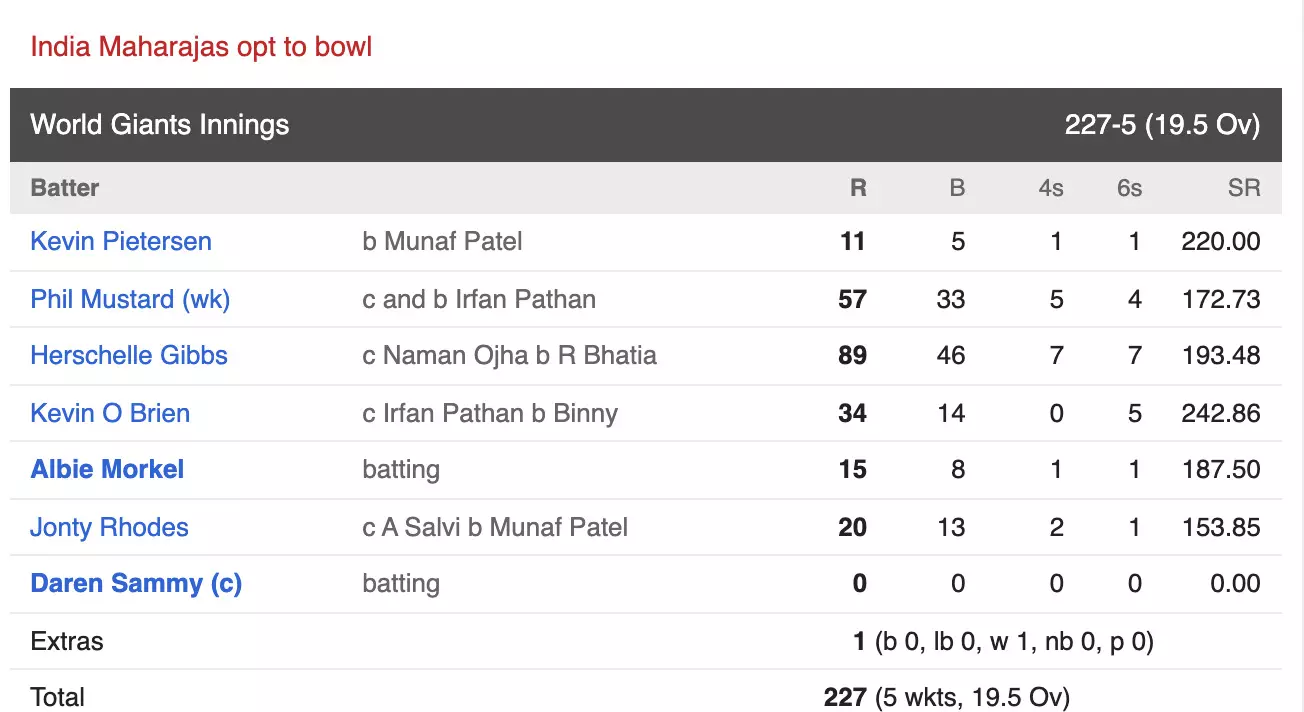 The World Giants post a mammoth total of 227-5 to end their inning, leaving a target of 228 or the India Maharajas.