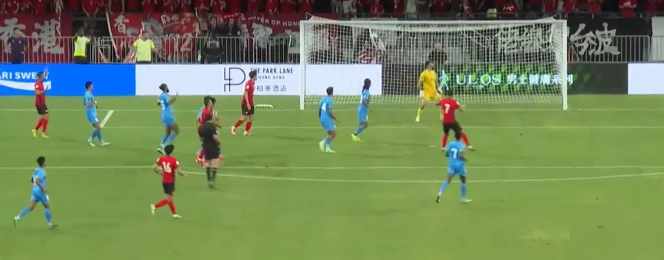India looking for a flick-on at the near post, but the Hong Kong defense is alive and their custodian clears his lines.