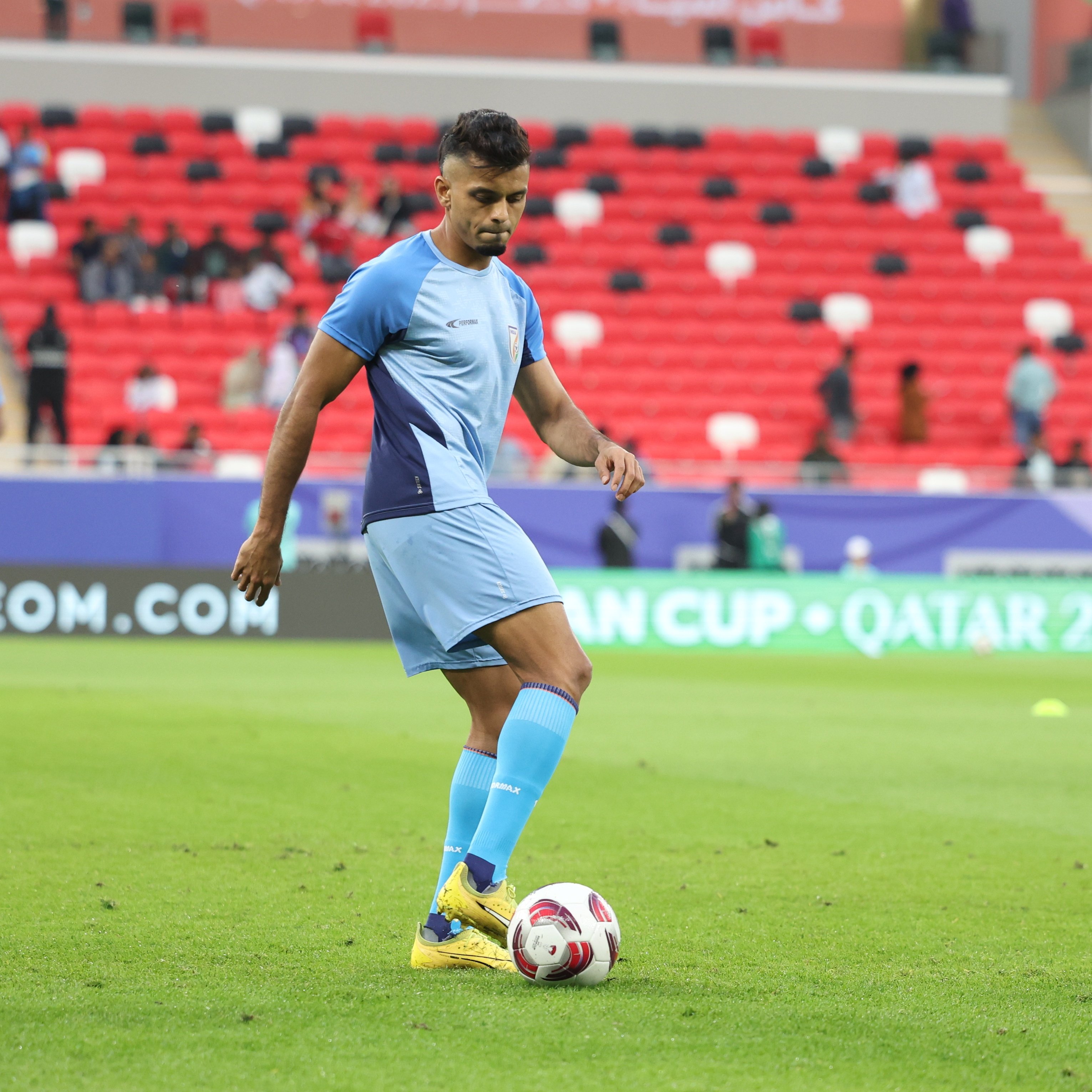 Anirudh Thapa kicks off the game at the Ahmad bin Ali Stadium. India is playing from left to right.