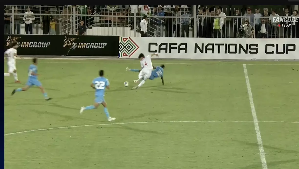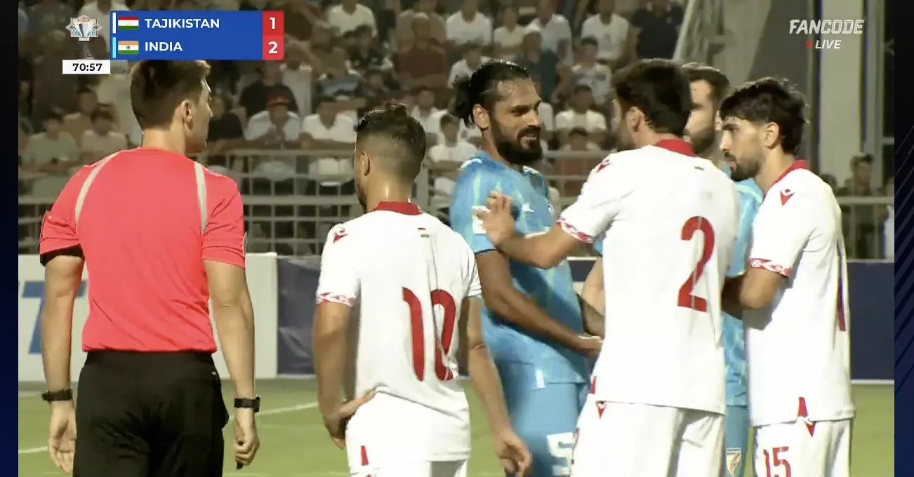 A foul inside the box gives Tajikistan a penalty. The Indian players are arguing with the referee, but it’s clear — Vikram Partap Singh fouled Rustam Soirov inside the box, and the referee awards the spot-kick.
