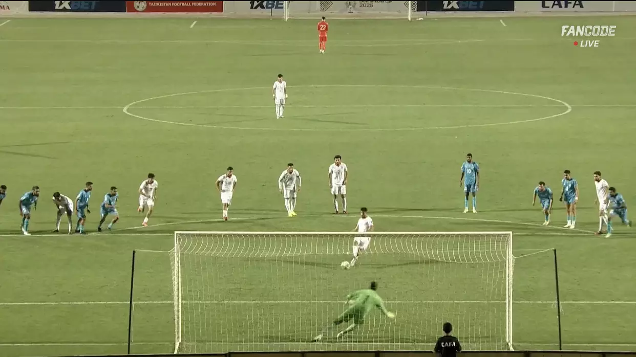 Rustam Soirov steps up to take the penalty for Tajikistan, but Gurpreet Singh Sandhu makes a brilliant save, diving low to deny the spot-kick. India survive a big scare!
