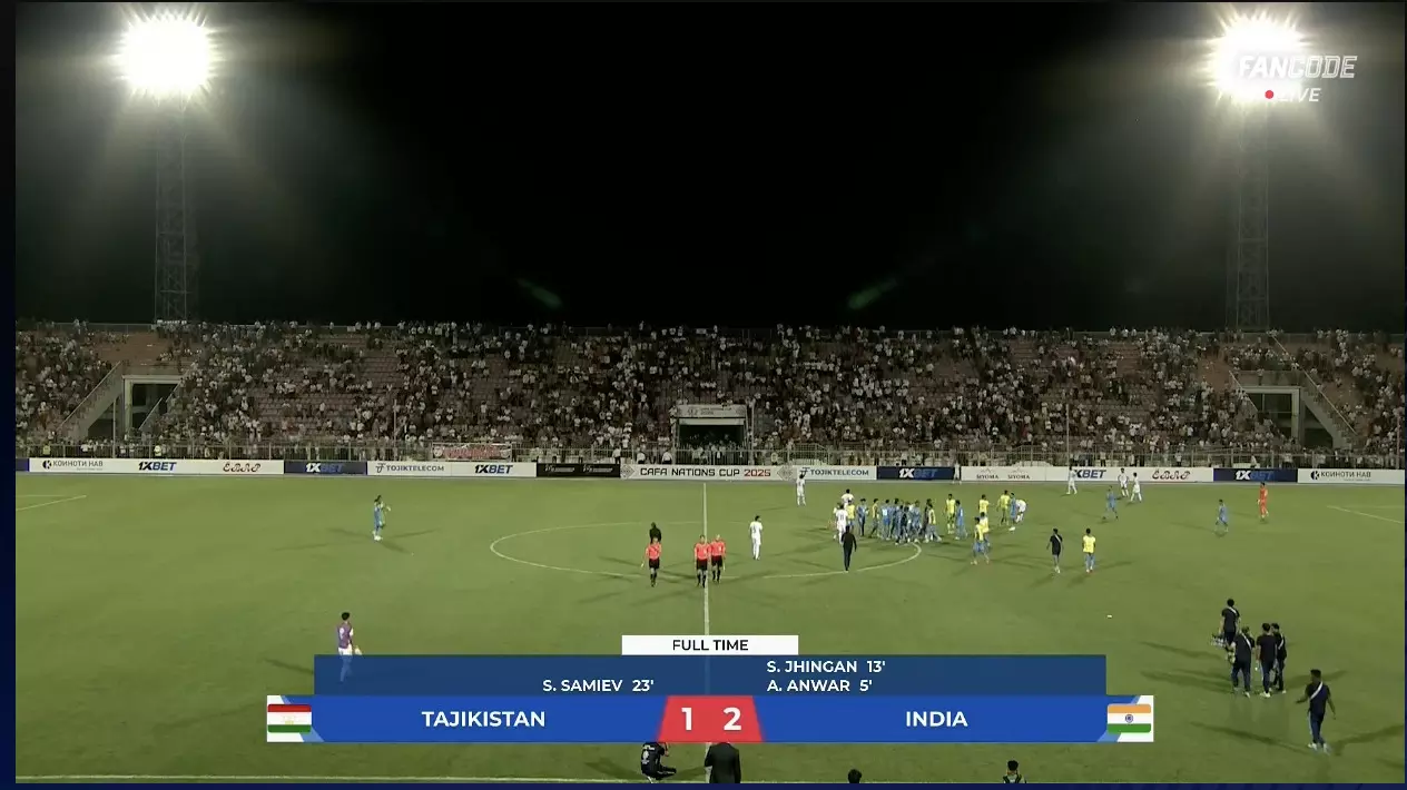 India kicked off their CAFA Nations Cup 2025 campaign with a hard-fought 2–1 win over hosts Tajikistan in Hisor. The Blue Tigers raced into a two-goal lead through Anwar Ali (4) and Sandesh Jhingan (5) inside the first 12 minutes. Tajikistan fought back with a well-taken strike from Shahrom Samiev (22) and pressed strongly in the second half.