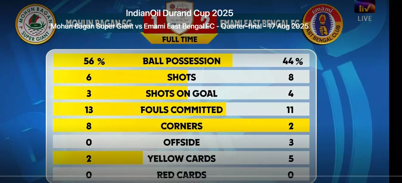 That's all we have from the Kolkata derby at the 2025 Durand Cup. East Bengal will play the semi-finals of the prestigious tournament against Diamond Harbor, who took down heavyweights Jamshedpur FC earlier in the day.
