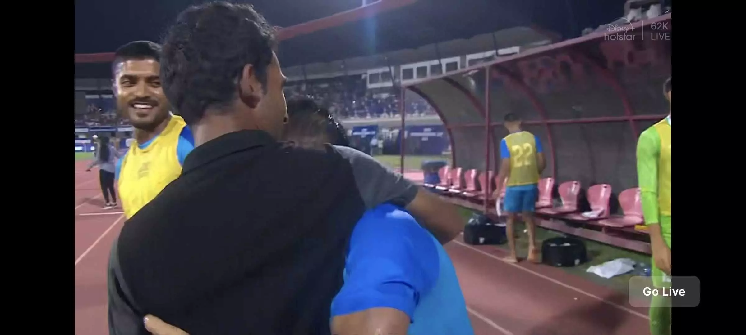 Mahesh tests the keeper with a heavy shot in added time. It's a party for the men in blue today! The bench is ready in anticipation.