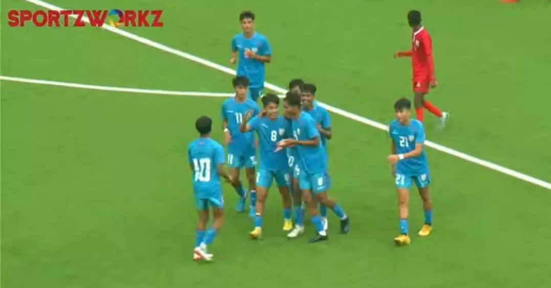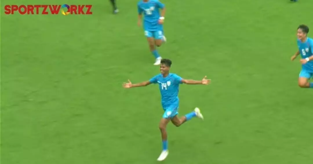 India continues to impress with a stunning third goal! Levis Zangminlun showcases incredible skill by chipping the ball over the head of the goalkeeper to find the back of the net. India now holds a commanding 3-0 lead.