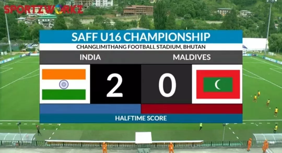 The first half comes to an end as the referee blows the whistle. India holds a 2-0 lead over Maldives at the halfway point in this SAFF U16 Championship semifinal.