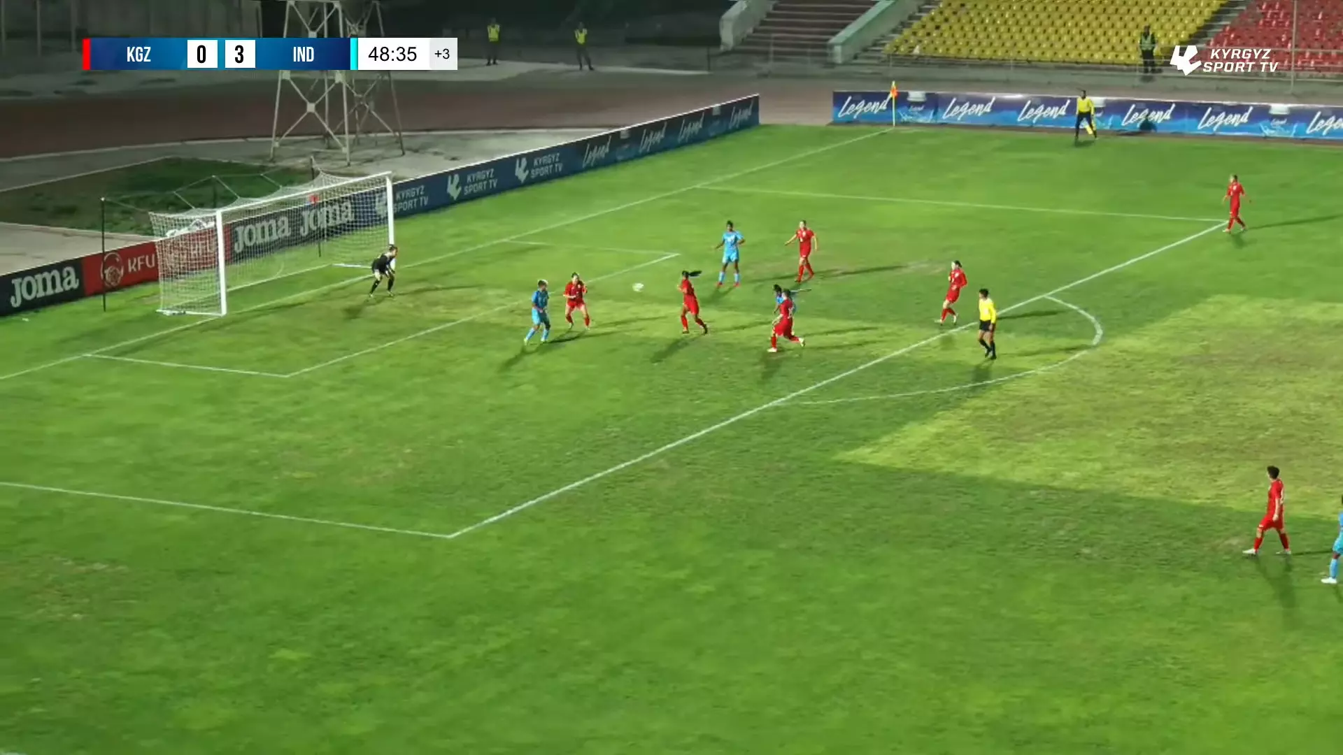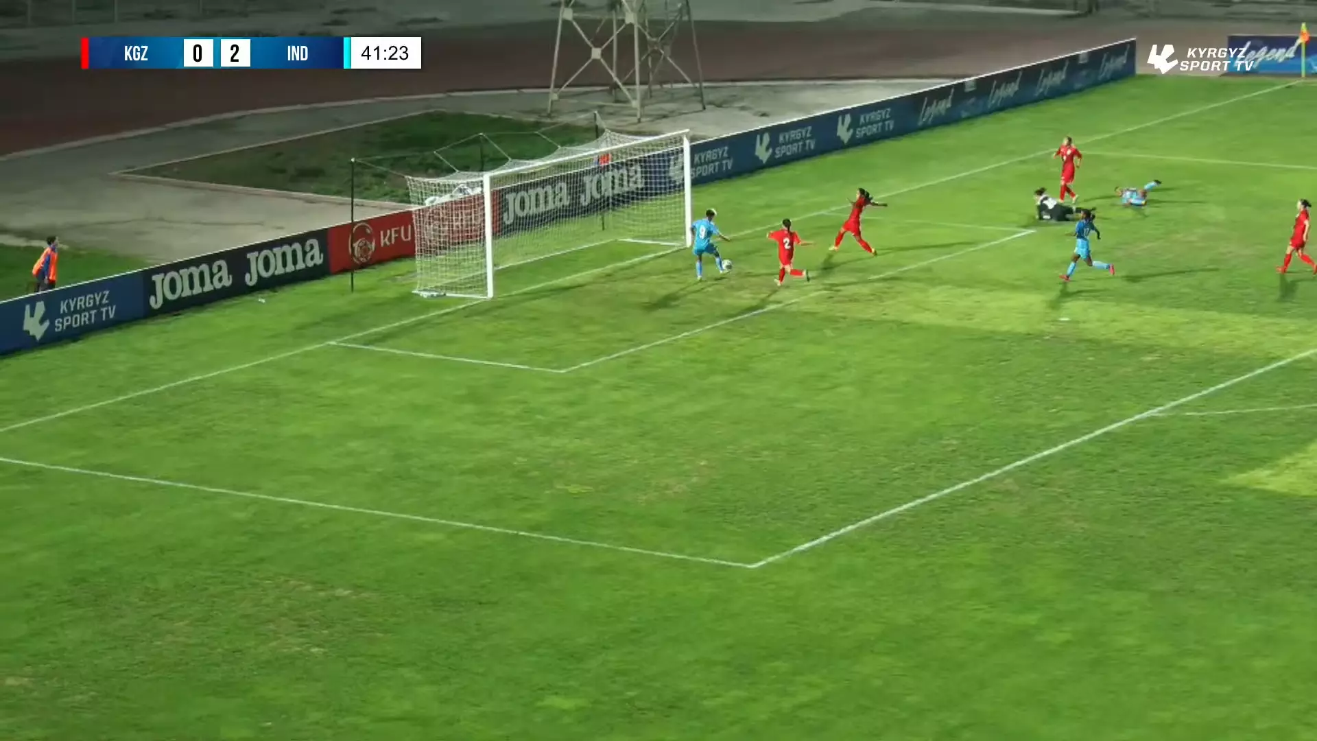 No explanation for why Indu stuttered while chasing the ball but the Kyrgyz goalkeeper makes another save as India searches for the fourth goal.