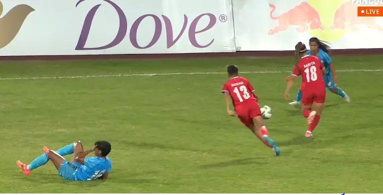 Lucky! India got lucky there. Sabitra Bandari through the middle and she takes the shot but Chanu denies, but the ball slips out of her hand and fall to a Nepal player. However it's cleared.