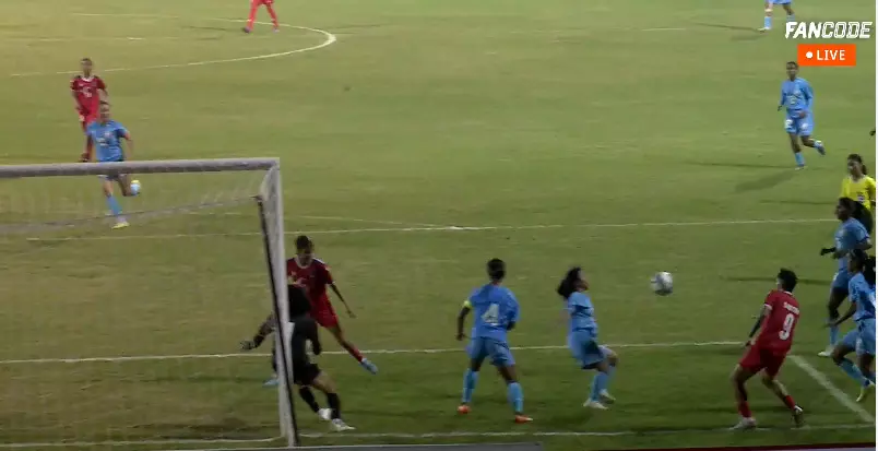 Just two minutes later, Jyothi Chauhan misses another. The ball from Manisha from a corner was well in position to be the first goal but the chance goes begging!