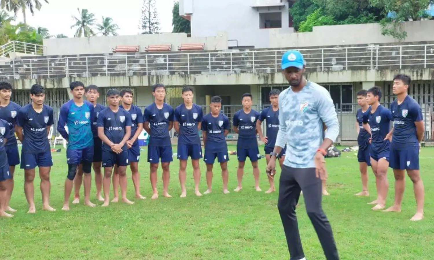 Indian U-17 players with coach Bibiano Fernandes. (Source: AIFF Media Team)