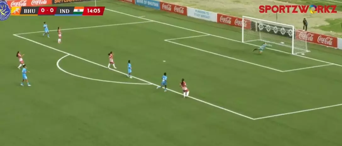 Divyani Linda delivers a brilliant cross from the left. The pass finds Nira Longjam approaching the box. She gets a touch, but the Bhutanese goalkeeper stands firm. A half-chance, but the danger is cleared.