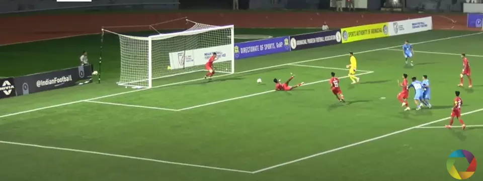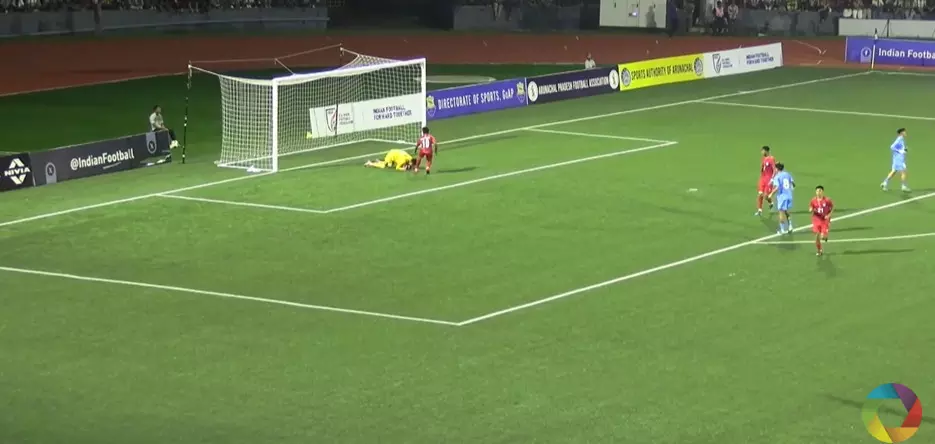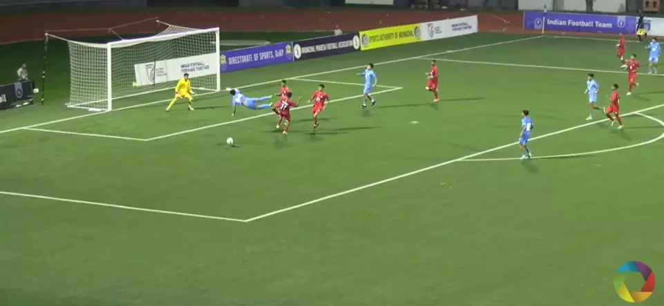 A pass from the right and Prashan Jajo pulls out an acrobatic attempt, trying to slot the ball in. Unfortunately for him and India, Jajo fails to connect.
