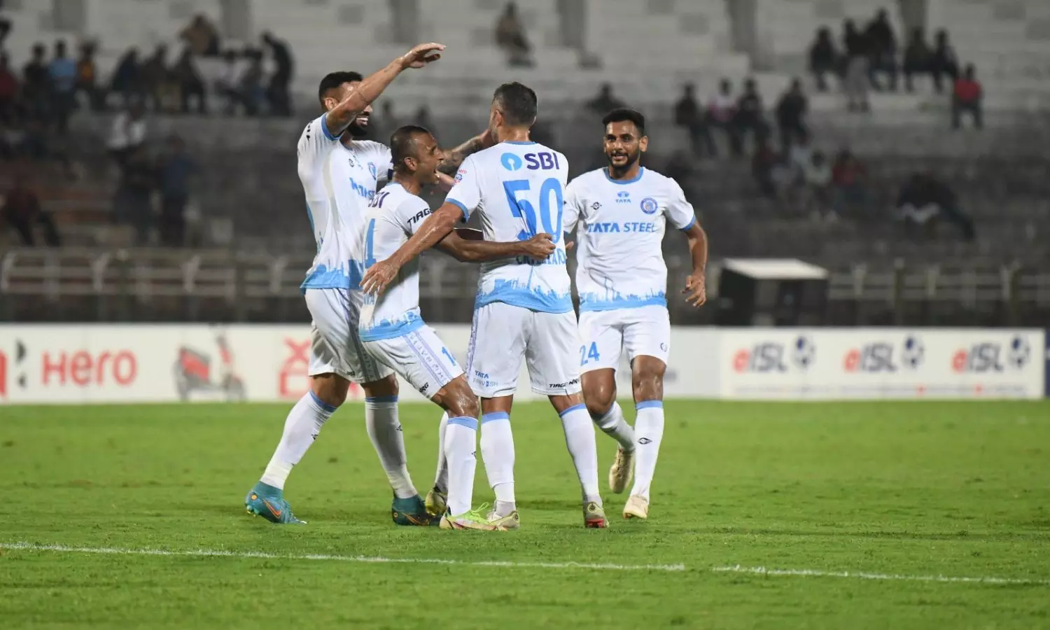 Jamshedpur FC celebrating a goal against FC Goa in their Hero Super Cup 2023 opener.