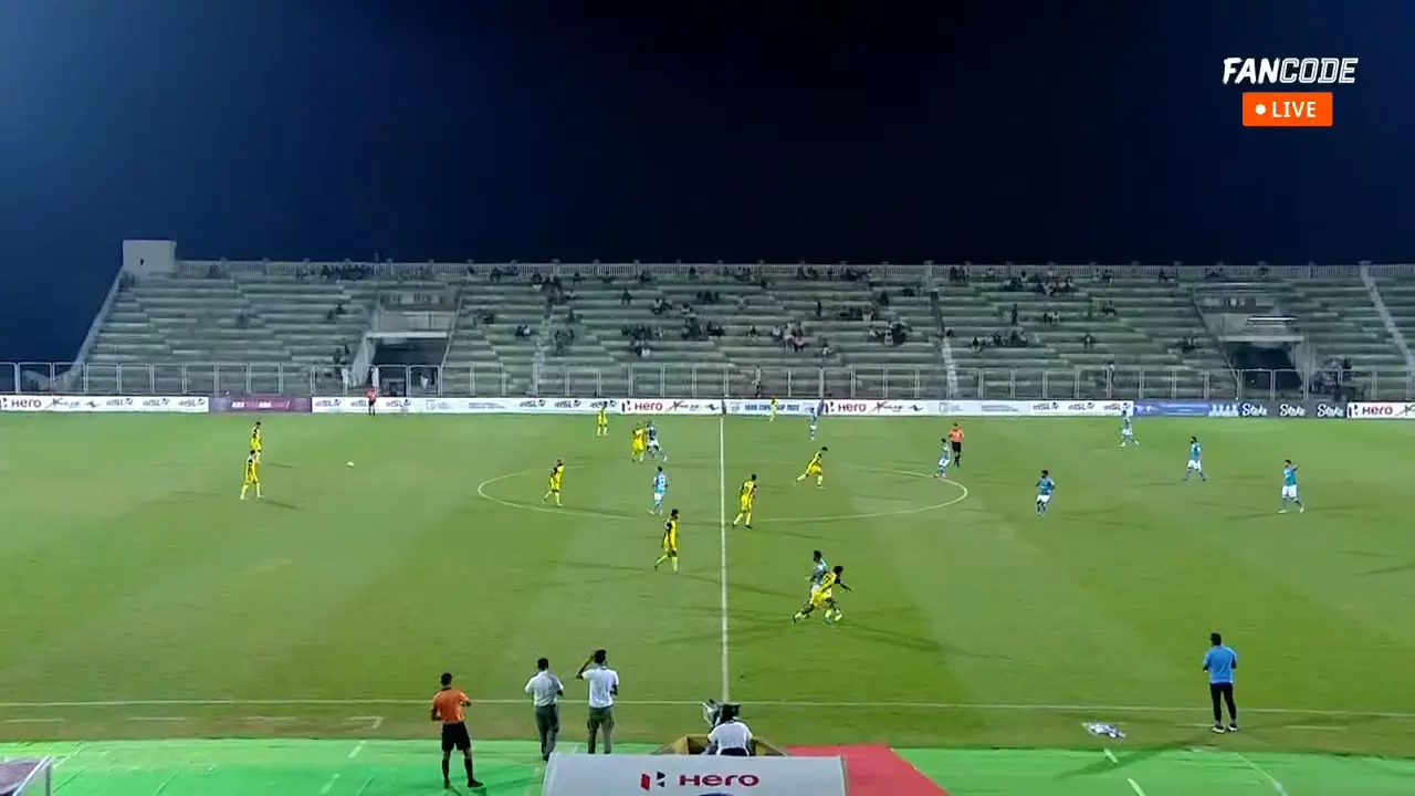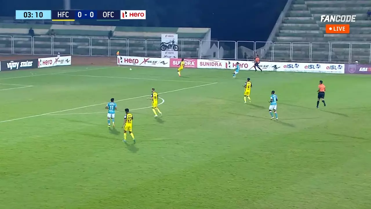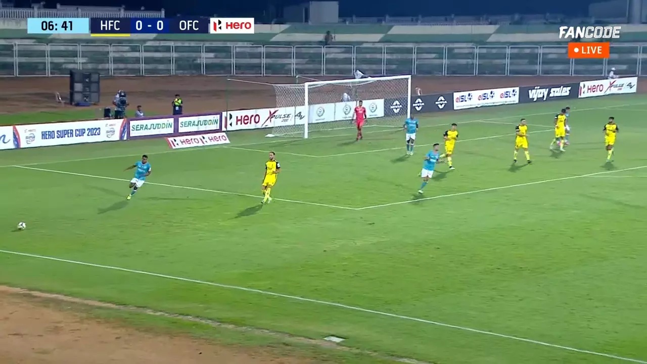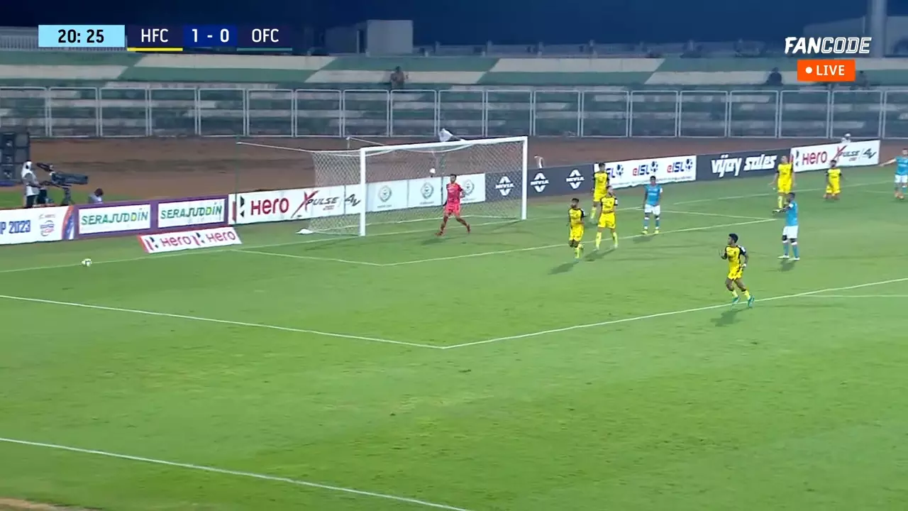 Sahil Panwar plays the corner in the box which almost falls to the unmarked Diego Mauricio but HFC survive at the moment.