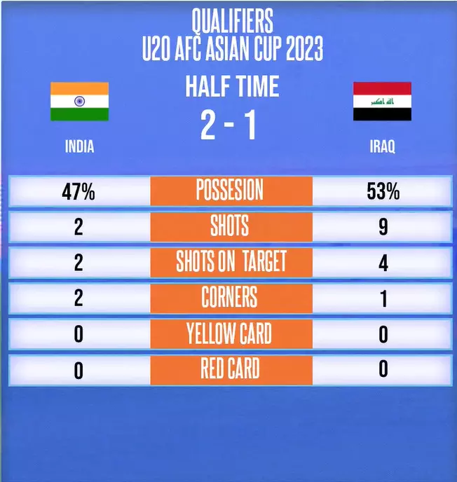 There goes the whistle and the Indians go into the half time with a one-goal lead after trailing for the first 20-odd minutes. Iraq started off well and India took their time to settle in. Once the early jitters were done with, the Indians grew in confidence and found the net twice on counters from the right flank.