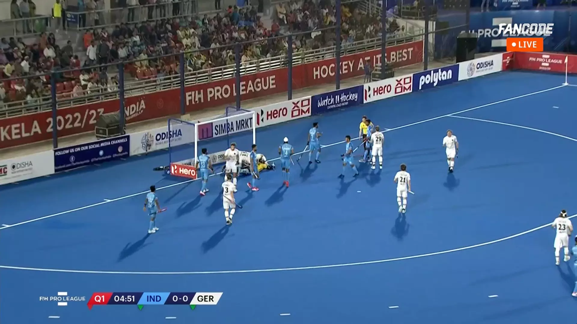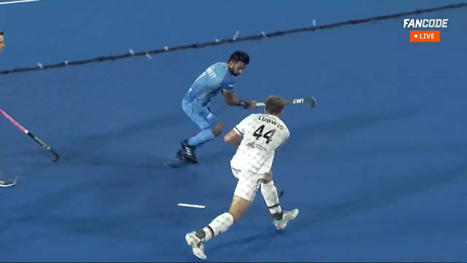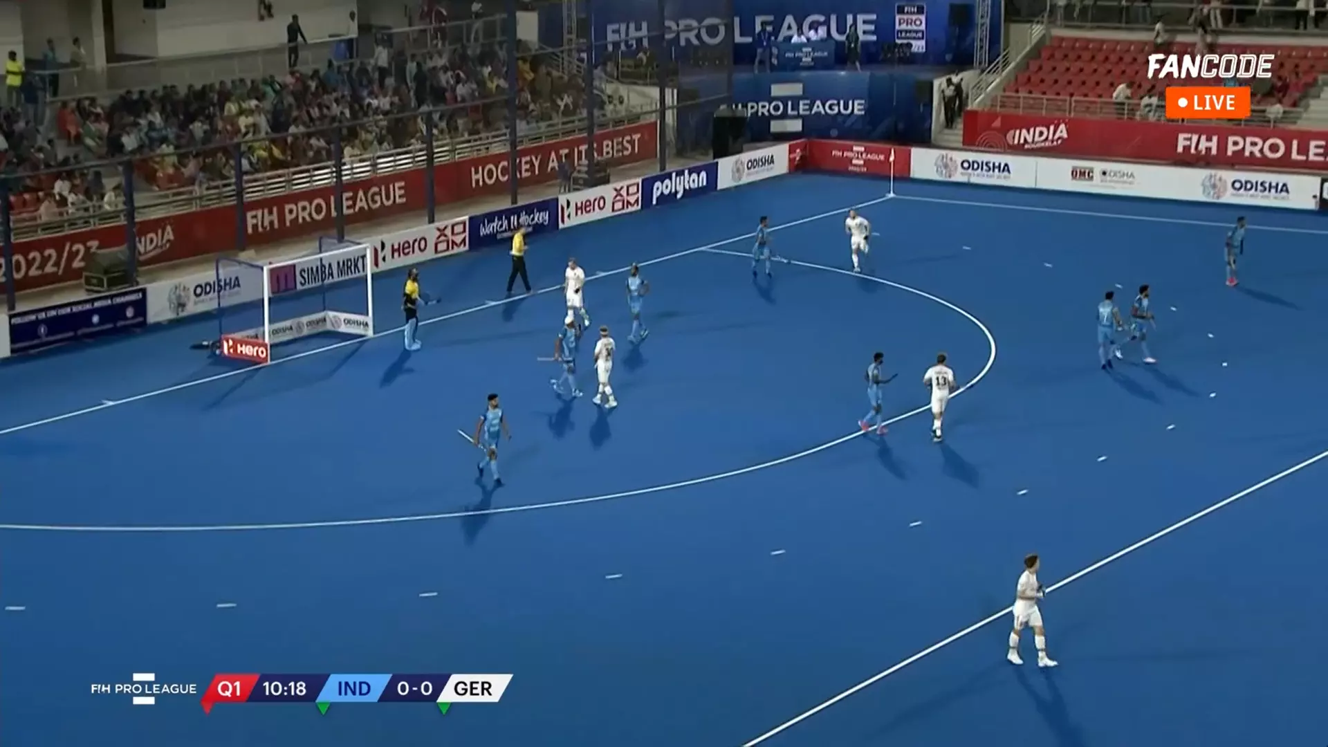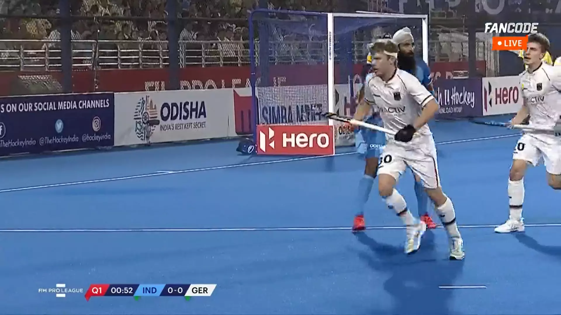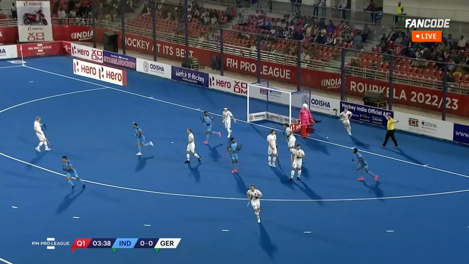 After few initial attacks, India has adopted a defensive approach and Germany are exploiting the spaces on both sides.