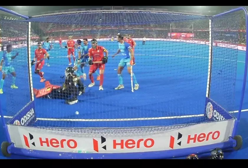A long drill down the ground from Amit Rohidas and the ball thuds into the goal post. It was hit from way outside the shooting circle and hence the Belgian goalkeeper just lets it by.