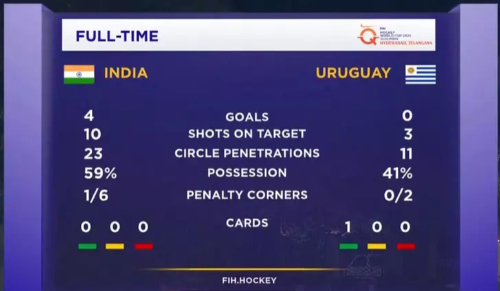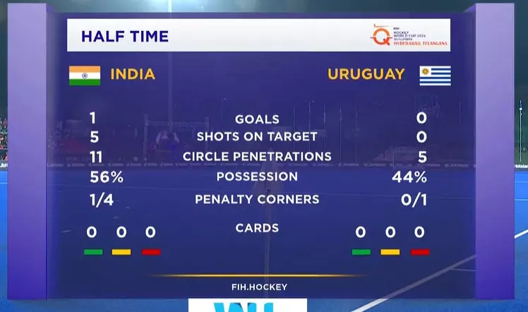Penalty Corners: India 4, Uruguay 1.