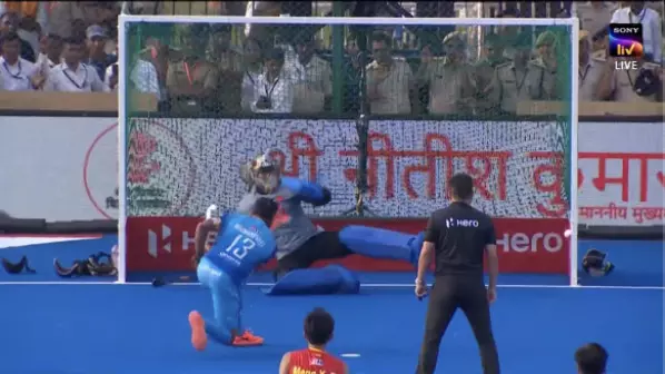 India are awarded a penalty stroke after Mandeep Singh is brought down by the Chinese goalkeeper. China review the decision, but the stroke stands. Harmanpreet steps up confidently, only to see his attempt crash against the post.