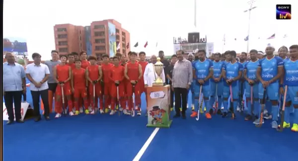 The referee blows the whistle to start the match in Rajgir, Bihar. India, donning their blue kit, will attack from left to right, while China moves from right to left, setting the stage for an exciting opener.