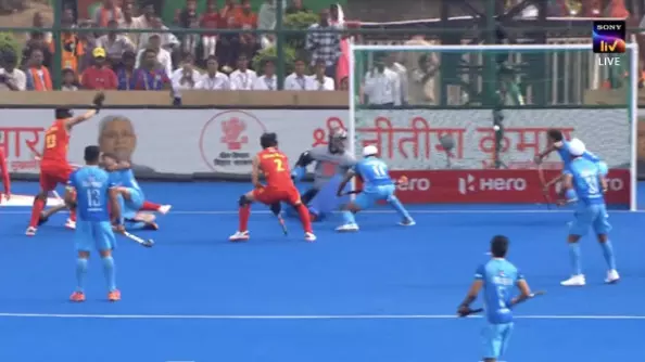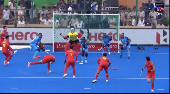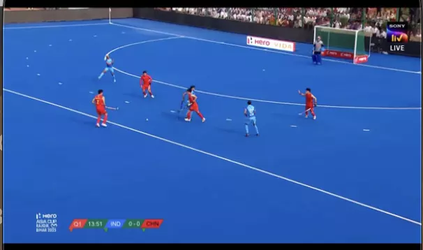 India launch an immediate attack as Abhishek drives into the circle and takes a powerful strike on goal. However, China’s goalkeeper Wang Wiehao is alert and blocks the attempt, keeping the scoreline level.