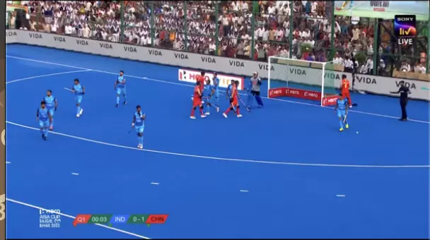 India earn a late penalty corner in the first quarter. Abhishek delivers a precise injection, and Harmanpreet unleashes a strike, but it sails wide. The first quarter ends with China holding a slender lead.