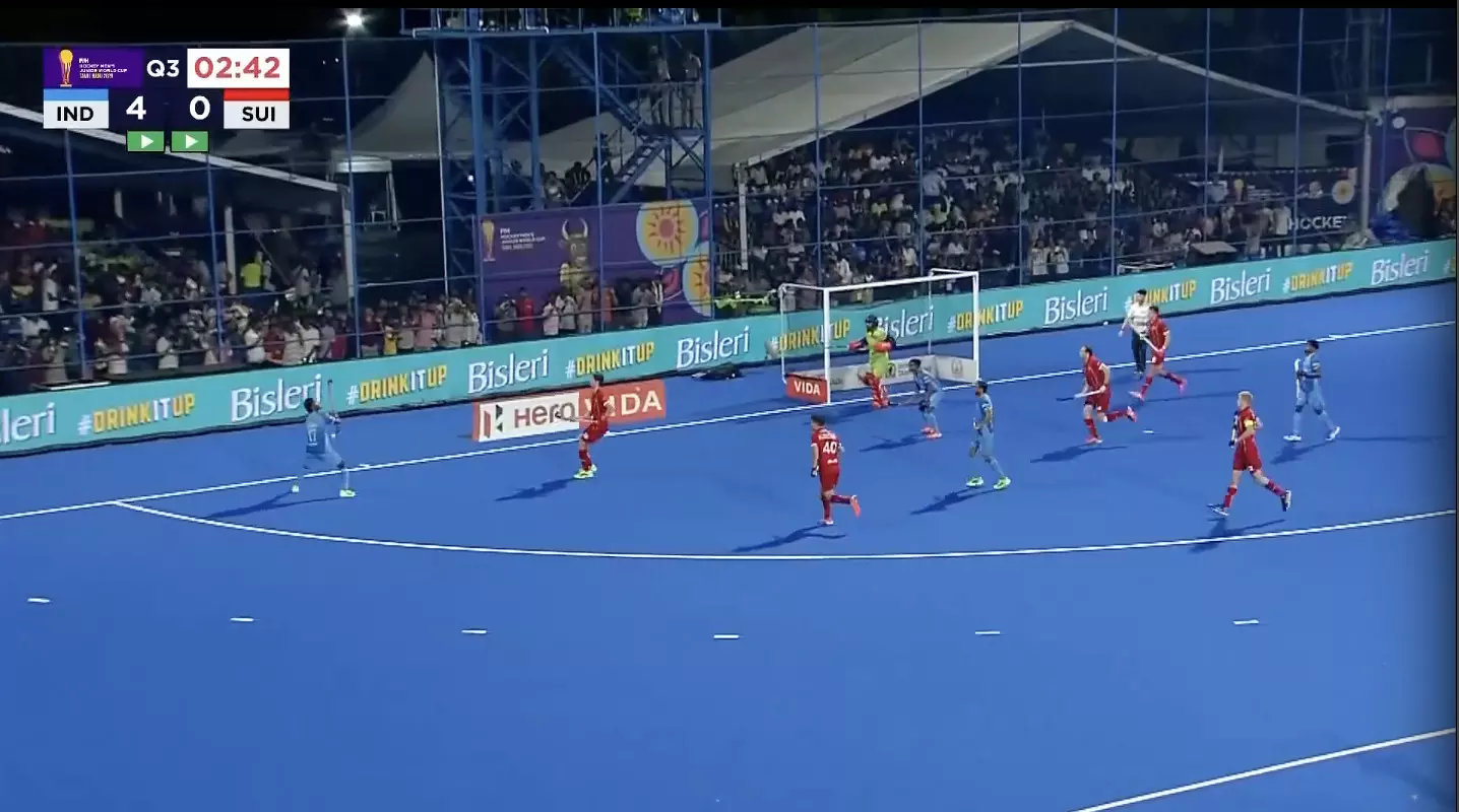 Switzerland earn back-to-back penalty corners, but India’s defence stands strong. The visitors still can’t find a way past the blue wall.
