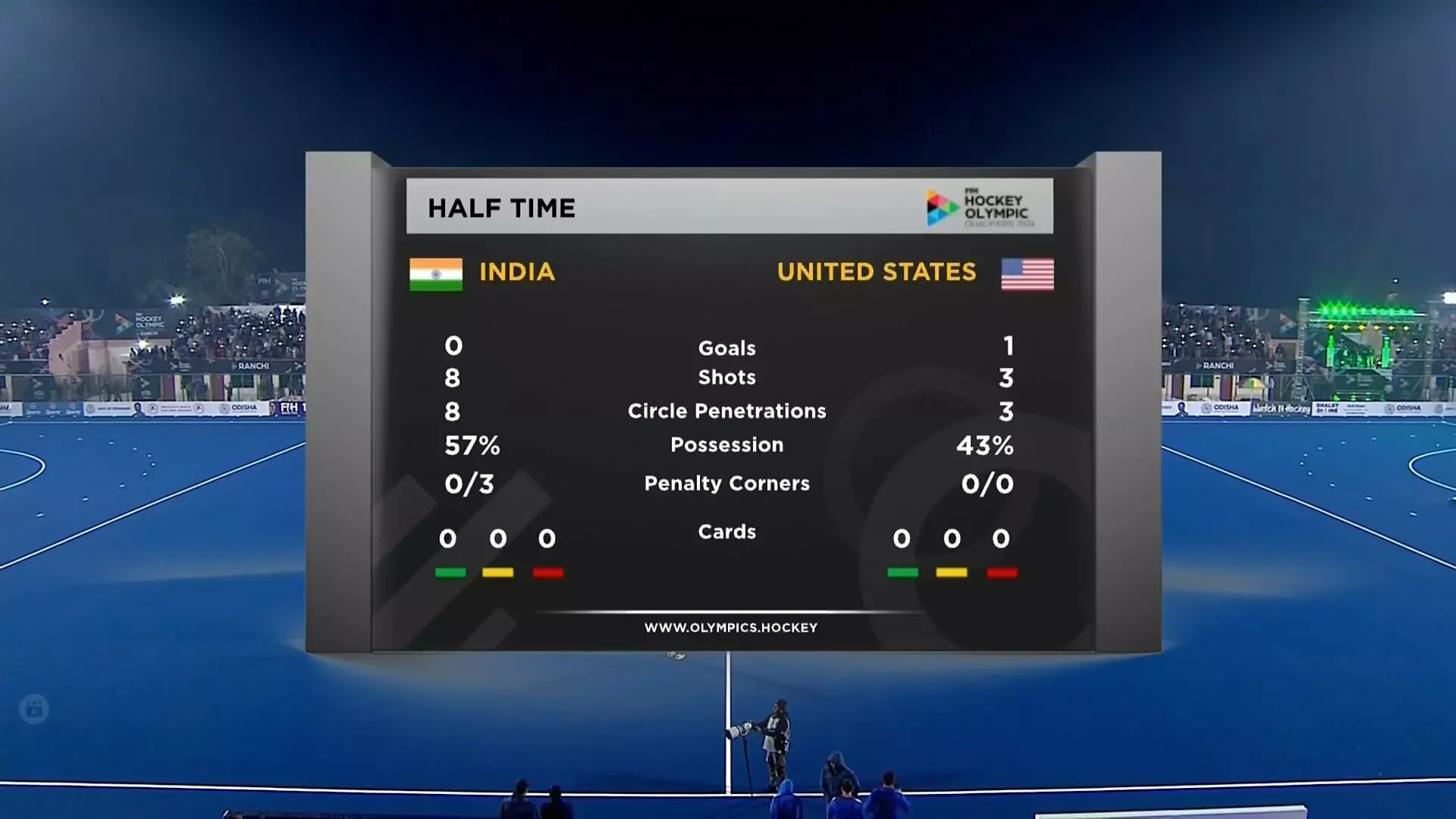 USA emerge clear winners in the first half with a brilliant first 18 minutes. They saw the first goal ruled out but scored again to make it 1-0. India stepped up after the goal but failed to convert three penalty corners and wasted some chances before the hooter.