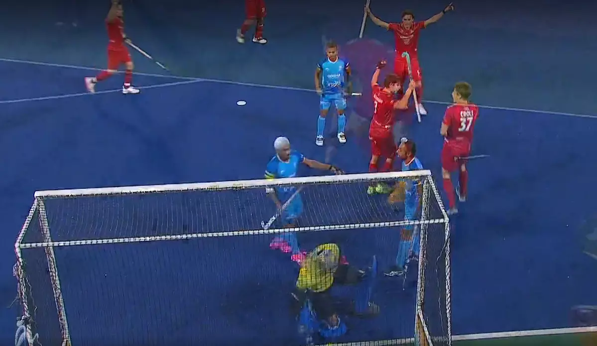 India have been stunned. A good run on the right from Belgium, before they penetrate via the base line. The ball is crossed to Thibeau Stockbroexx, who makes no mistake in slotting it in.
