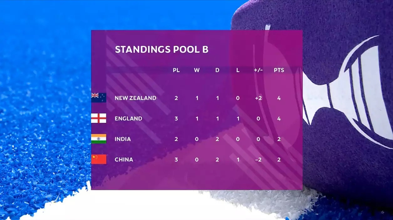 England defeated China 2-0 effectively leaving them with 2 points. If India beats New Zealand, India will qualify directly for the quarter-finals. A draw will take India to crossovers and a loss with more than 2 goals will knock India out.