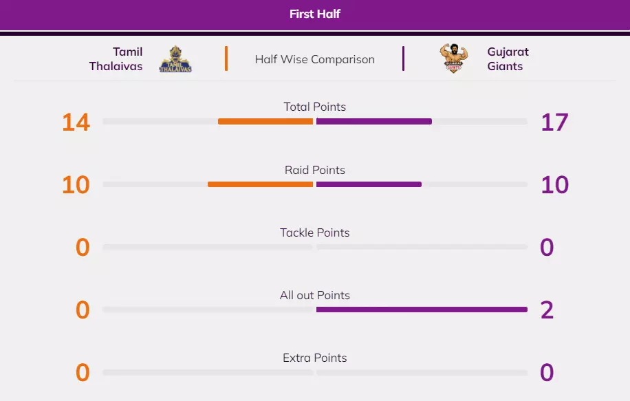End of the first half and the Giants have a three-point lead, thanks to that all-out. Ajinkya Pawar was the only saving grace for the Thalaivas having come in as a substitute and they would expect a much better show in the final 20 minutes.