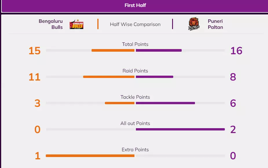 Despite that all-out the Bulls have done well to trail by just a single point after 20 minutes. Mohit Goyat has been the star for Puneri Paltan with two multi-point do-or-die raids.