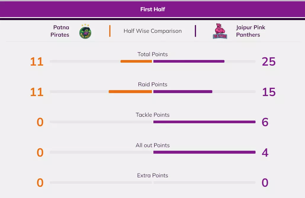 Jaipur Pink Panthers half. The Pirates defence which has been the best in the season so far has 0 tackle points in this half to go with 13 unsuccessful attempts.