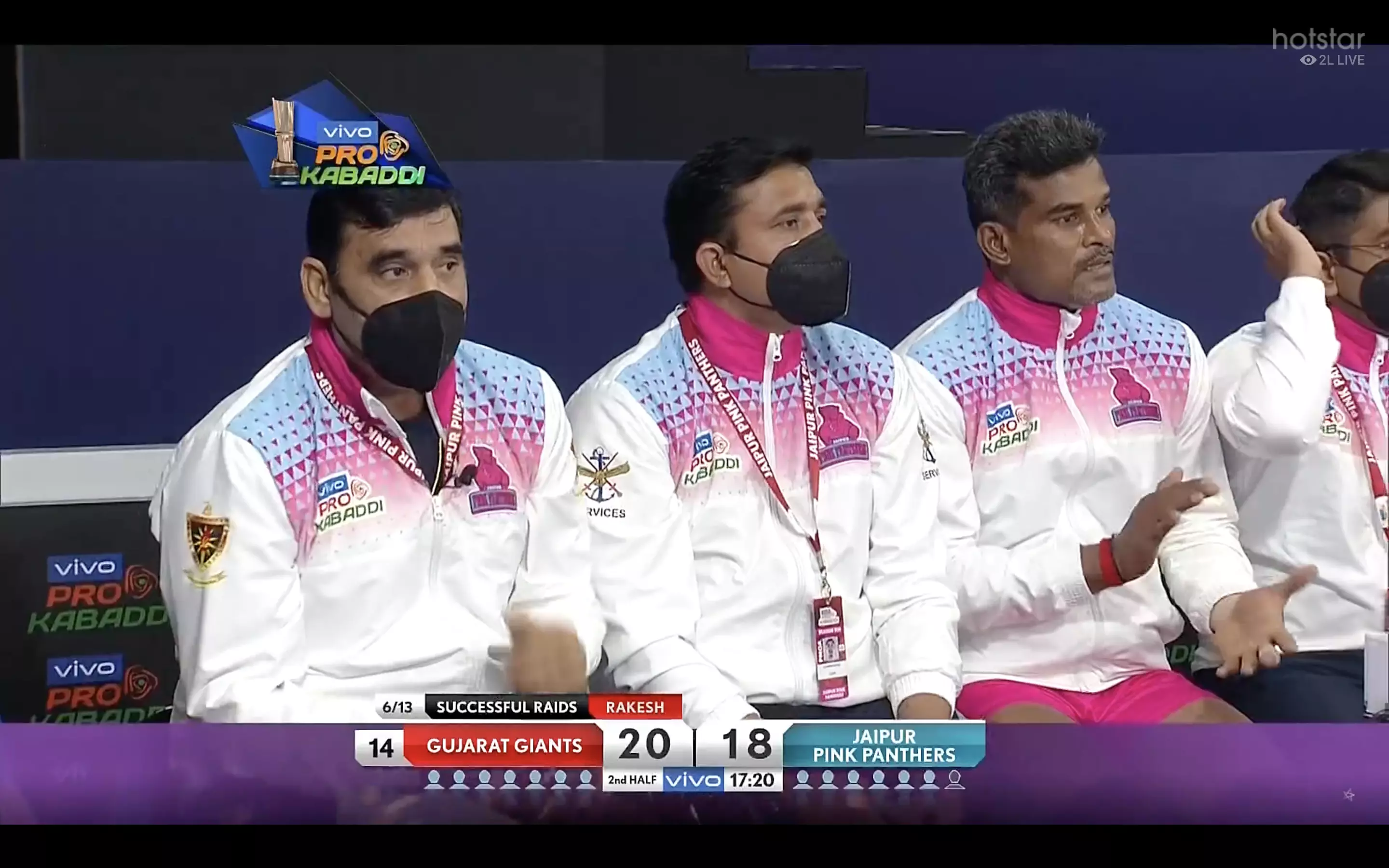 Gujrata Giants close the gap to 7-7 and has all players inside mat while opponents Jaipur Pink Panthers have 3 players out