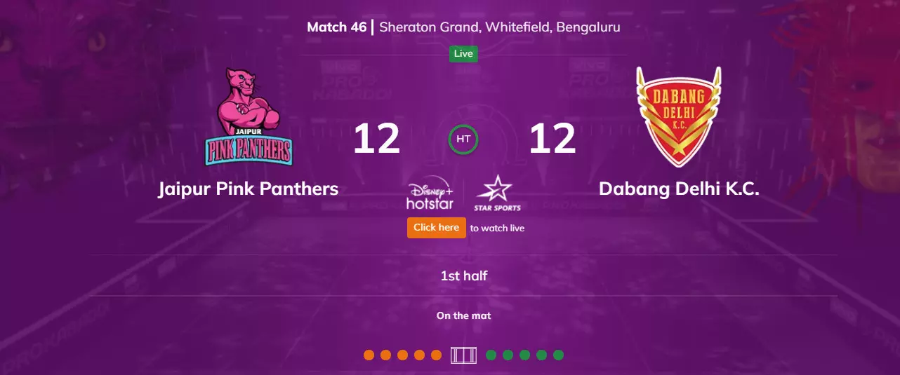 End of the first half and the scores are level. A brilliant fightback from Jaipur Pink Panthers after being reduced to three men. But, the story of the half so far has been both Naveen Goyat and Arjun Deshwal not troubling the scorers much.