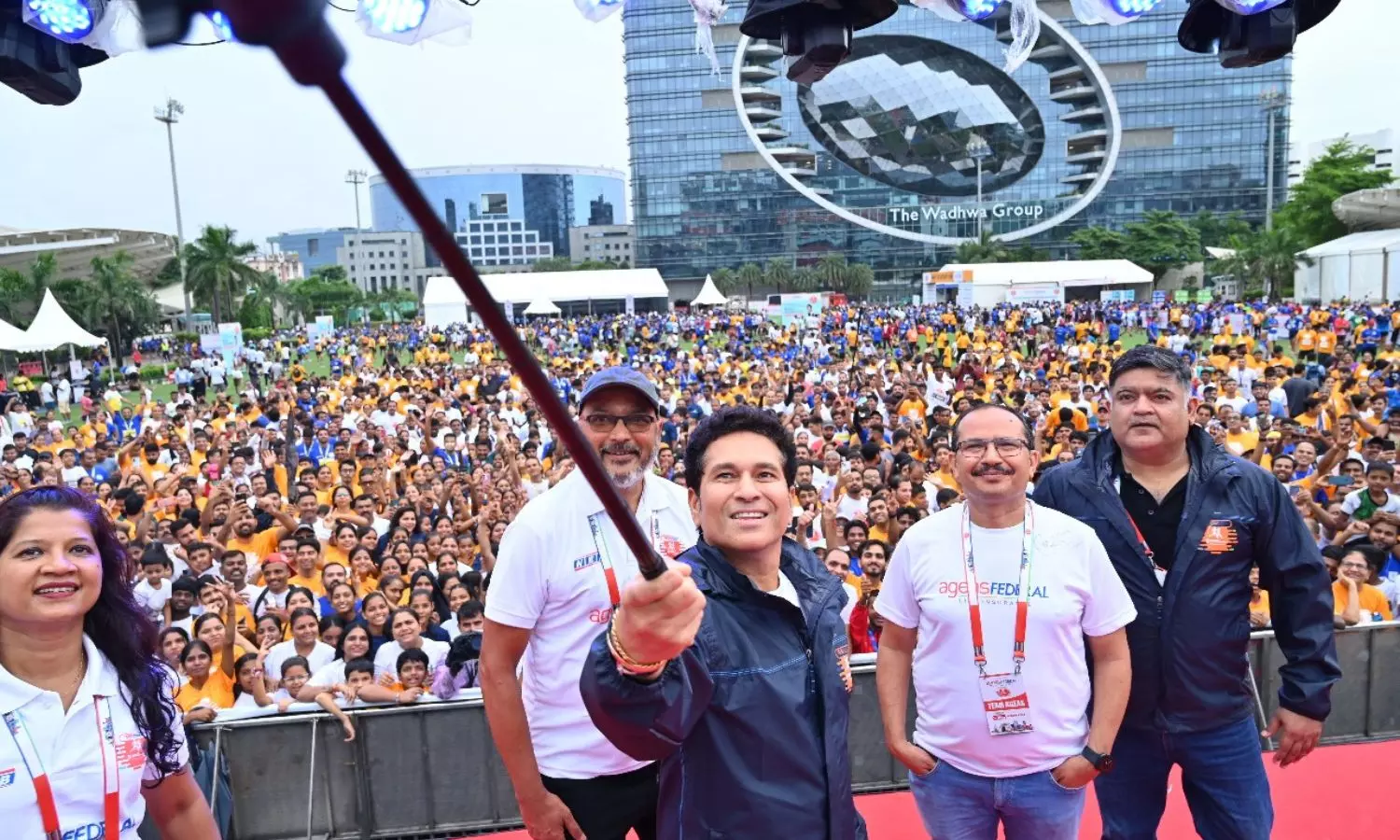 Ageas Federal Life Insurance brand ambassador Sachin Tendulkar takes a selfie with the participants of the 8th AFLI Mumbai Half Marathon on Sunday morning. AFLI CEO Arvind Shahi and Race Director Nagraj Adiga of NEB Sports are also seen.
