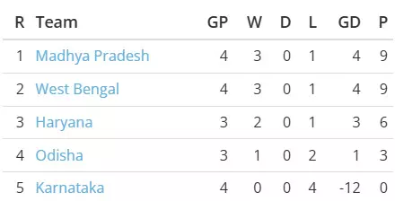 Madhya Pradesh continued to lead the points table of group A with 9 points out of 4 matches, closely followed by West Bengal, who defeated Karnataka in their final group match.