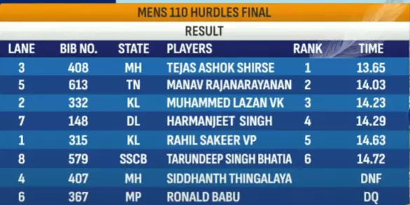 Athletics: Tejas Shirse wins the men's 100m hurdles with a timing of 13.65s