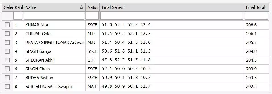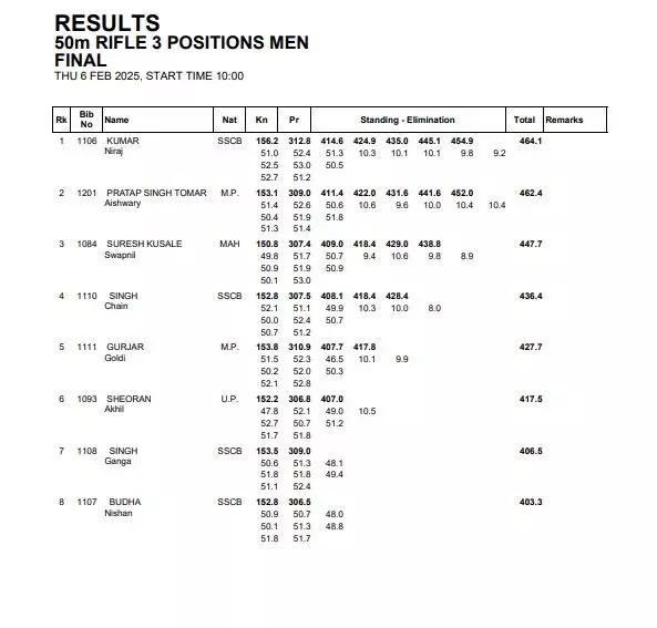 Niraj Kumar wins the gold medal, while Aishwary Pratap Singh Tomar and Olympic bronze medallist Swapnil Kusale bag the silver and the bronze medals.