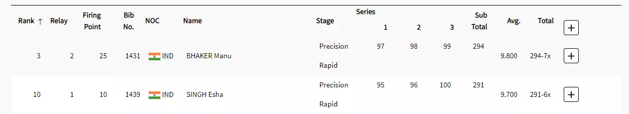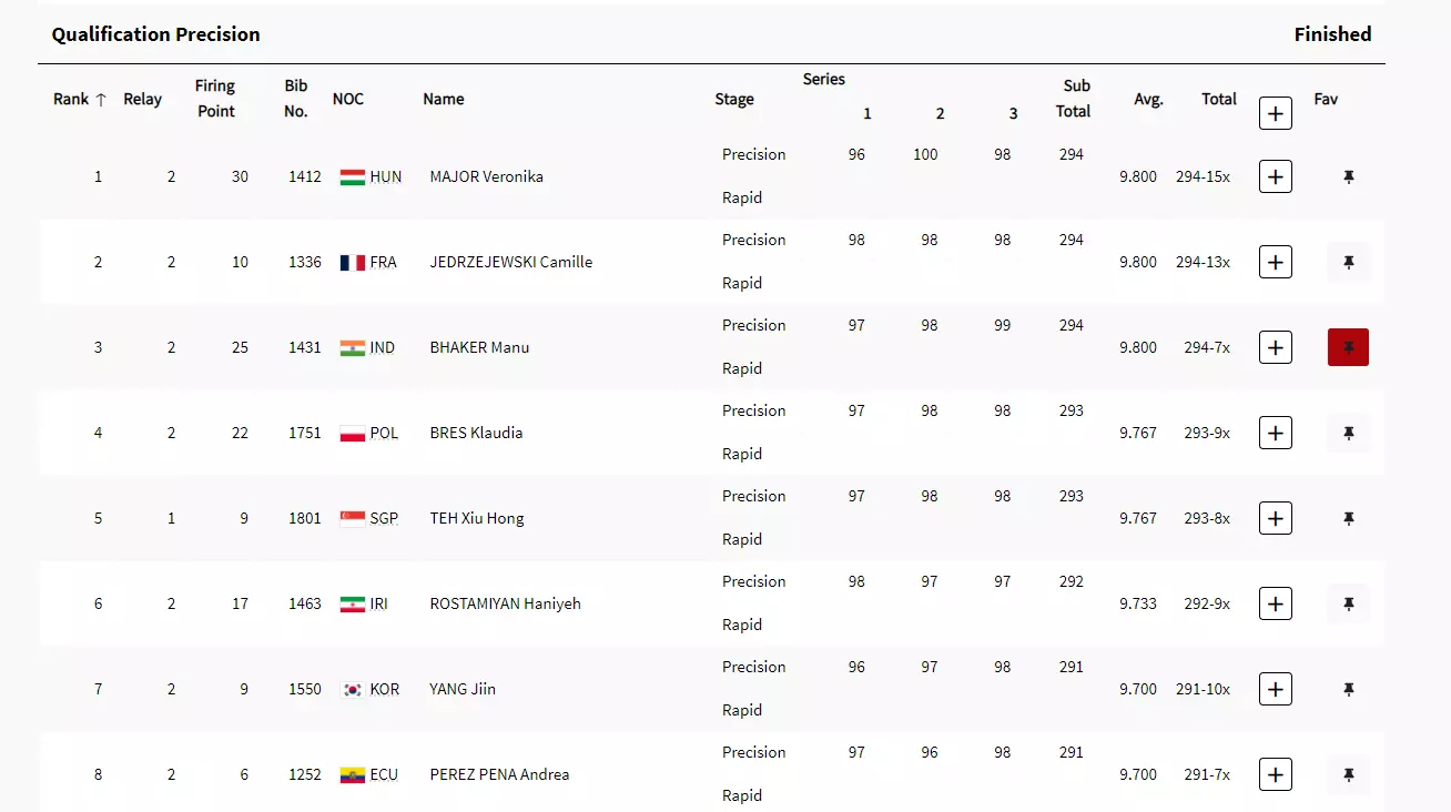After the end of two rounds in the rapid-fire rounds, Manu Bhaker is tied at the first position with a score of 492/500.